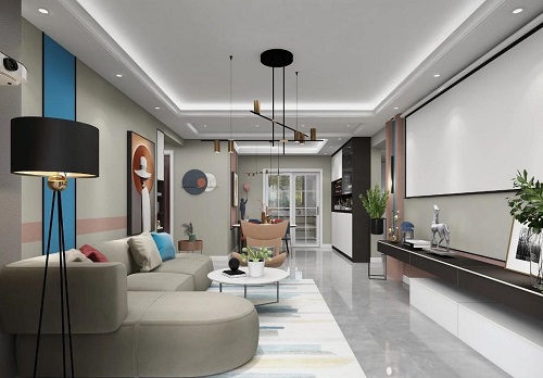 客廳以輕柔的色彩暈染開,一切色彩的比例、線條被安排得剛剛好,冷靜而克制的基路伯煙灰色邂逅溫柔治愈的皮粉色,是驚喜亦是藝術相迎,再以天空藍點綴,整個空間層次感分明,溫馨舒適。