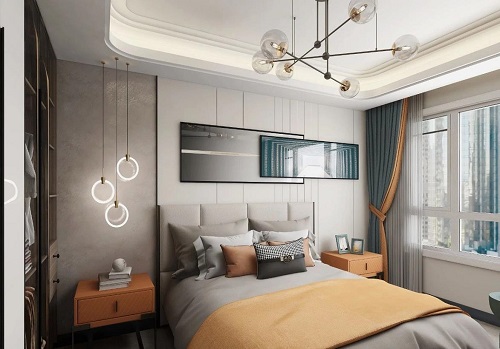 臥室,迎合了當(dāng)下追求輕感、簡(jiǎn)約化的家裝定制,藍(lán)色和橙色成為高級(jí)灰空間的視線牽引點(diǎn),將浪漫緩緩鋪開,嵌入膚質(zhì)觸感的柜體,與原木銜接,將美感與功能完美結(jié)合。